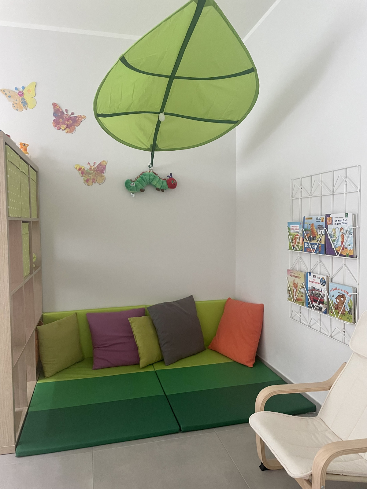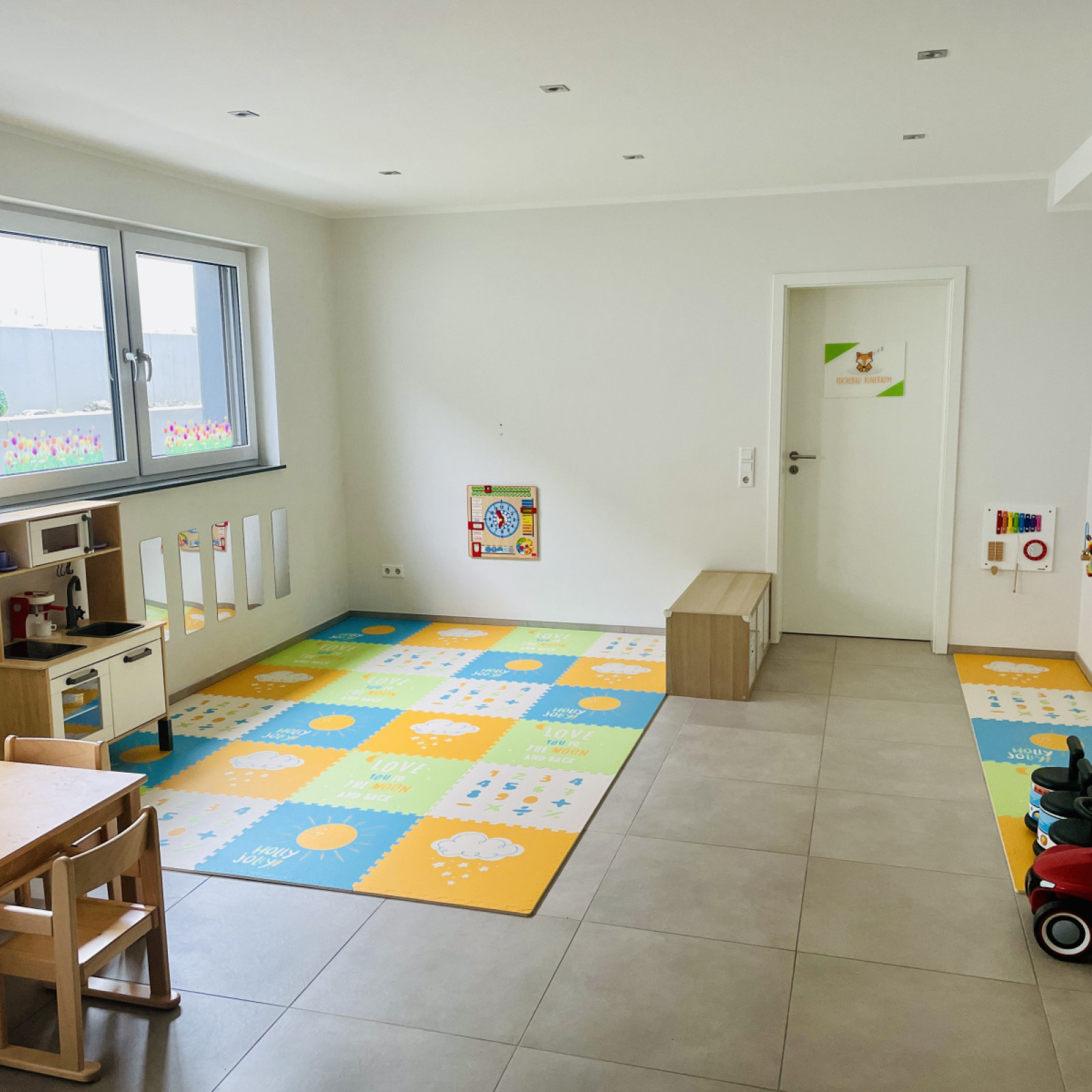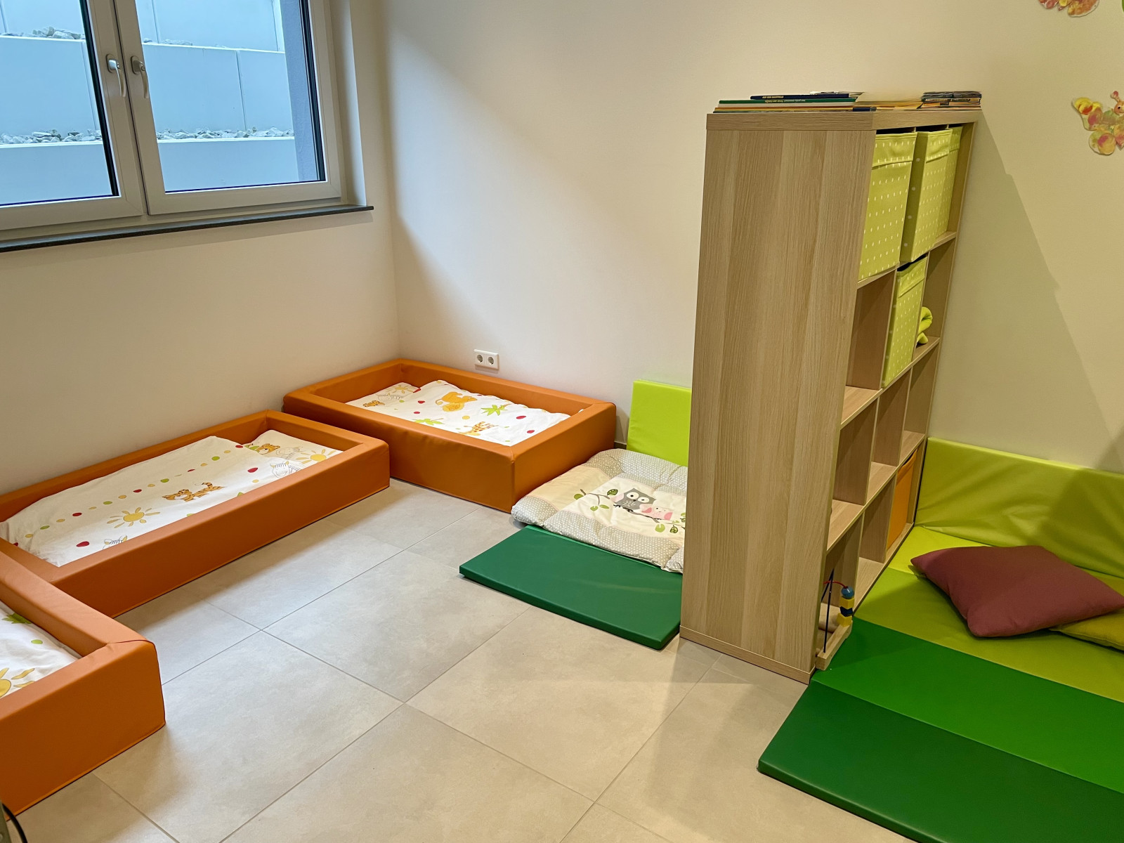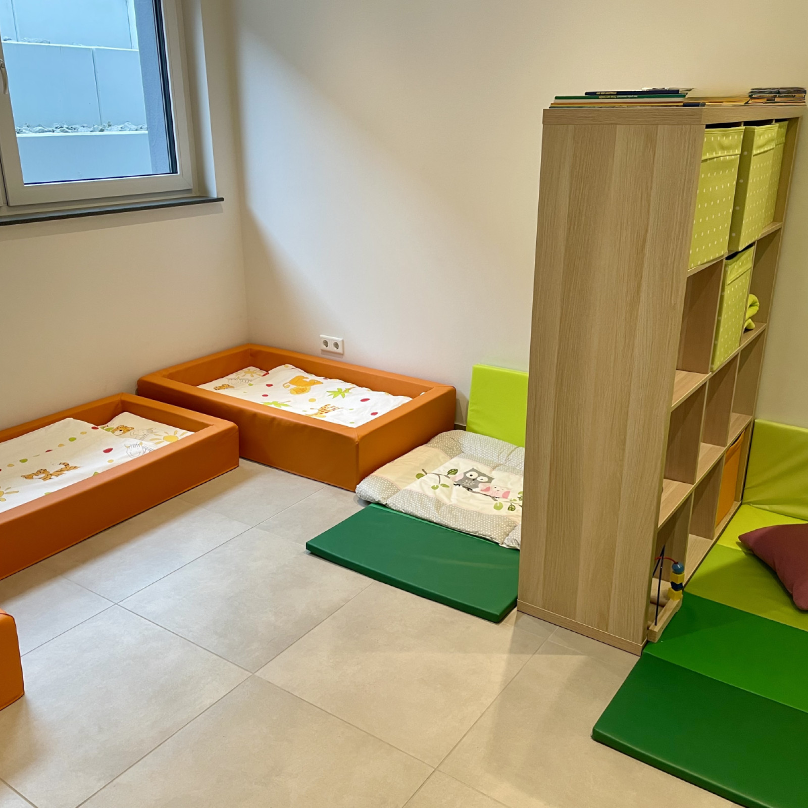 Kinder haben besondere Bedürfnisse an die Einrichtung: Das Badezimmer enthält einen Montessori-Lernturm sowie Töpfchen, sodass die Kinder selbstständig und sicher an alltäglichen Pflege- und Toilettensituationen teilnehmen können. Für den Mittagsschlaf oder um sich auszuruhen gibt es den Schlafbereich mit einem eigenen Bett für jedes Kind. Die Küche ist besonders wichtig: hier bereiten wir – auch oft gemeinsam mit den Kindern – die Mahlzeiten zu und lassen es uns zusammen schmecken. In den Räumen gibt es verschiedene Bereiche zum Basteln, Lesen oder Spielen.