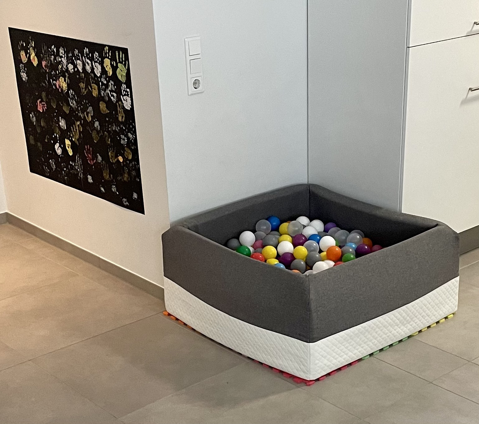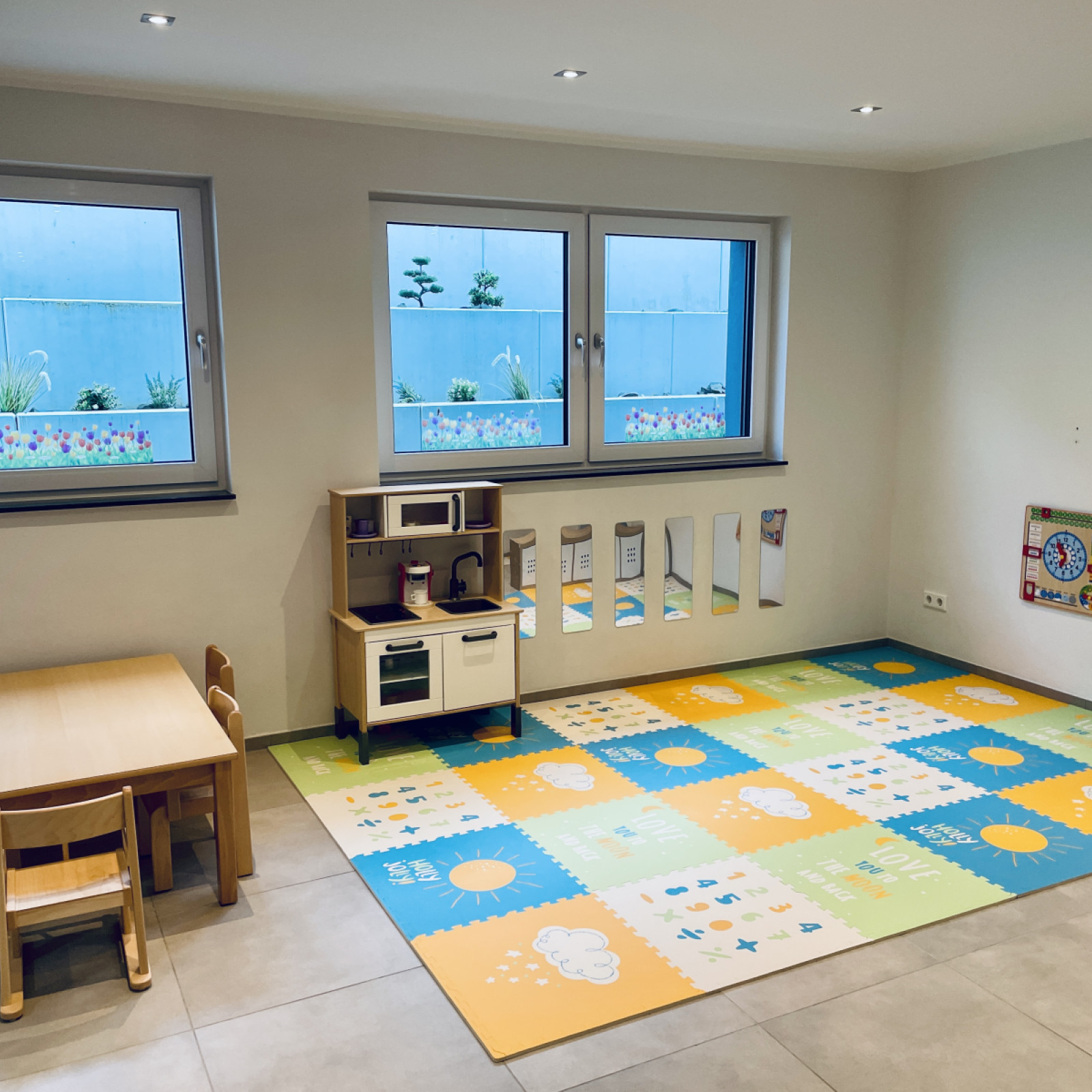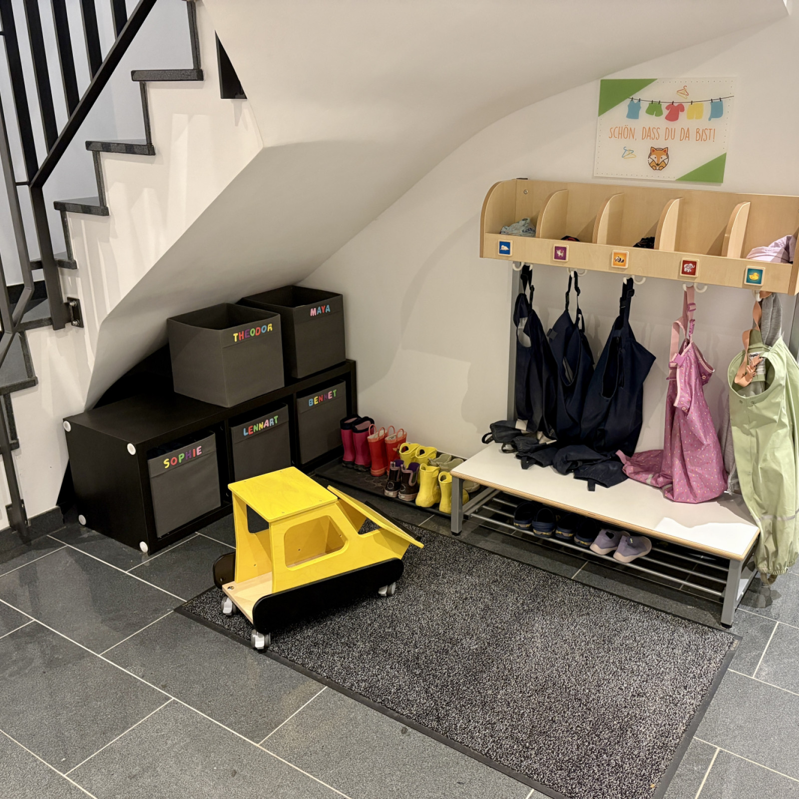 Kinder haben besondere Bedürfnisse an die Einrichtung: Das Badezimmer enthält einen Montessori-Lernturm sowie Töpfchen, sodass die Kinder selbstständig und sicher an alltäglichen Pflege- und Toilettensituationen teilnehmen können. Für den Mittagsschlaf oder um sich auszuruhen gibt es den Schlafbereich mit einem eigenen Bett für jedes Kind. Die Küche ist besonders wichtig: hier bereiten wir – auch oft gemeinsam mit den Kindern – die Mahlzeiten zu und lassen es uns zusammen schmecken. In den Räumen gibt es verschiedene Bereiche zum Basteln, Lesen oder Spielen.