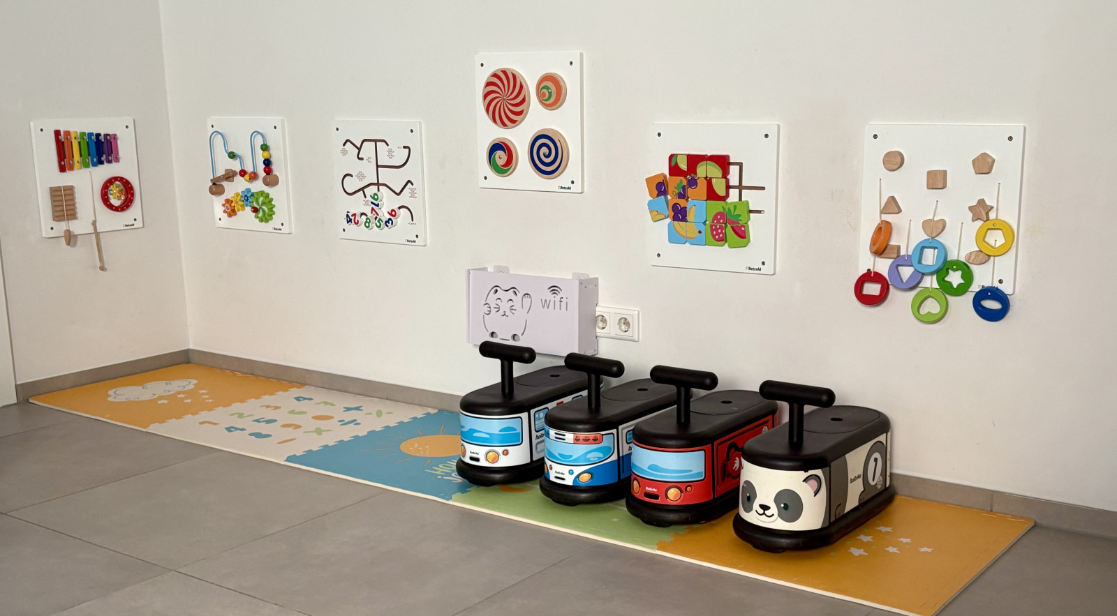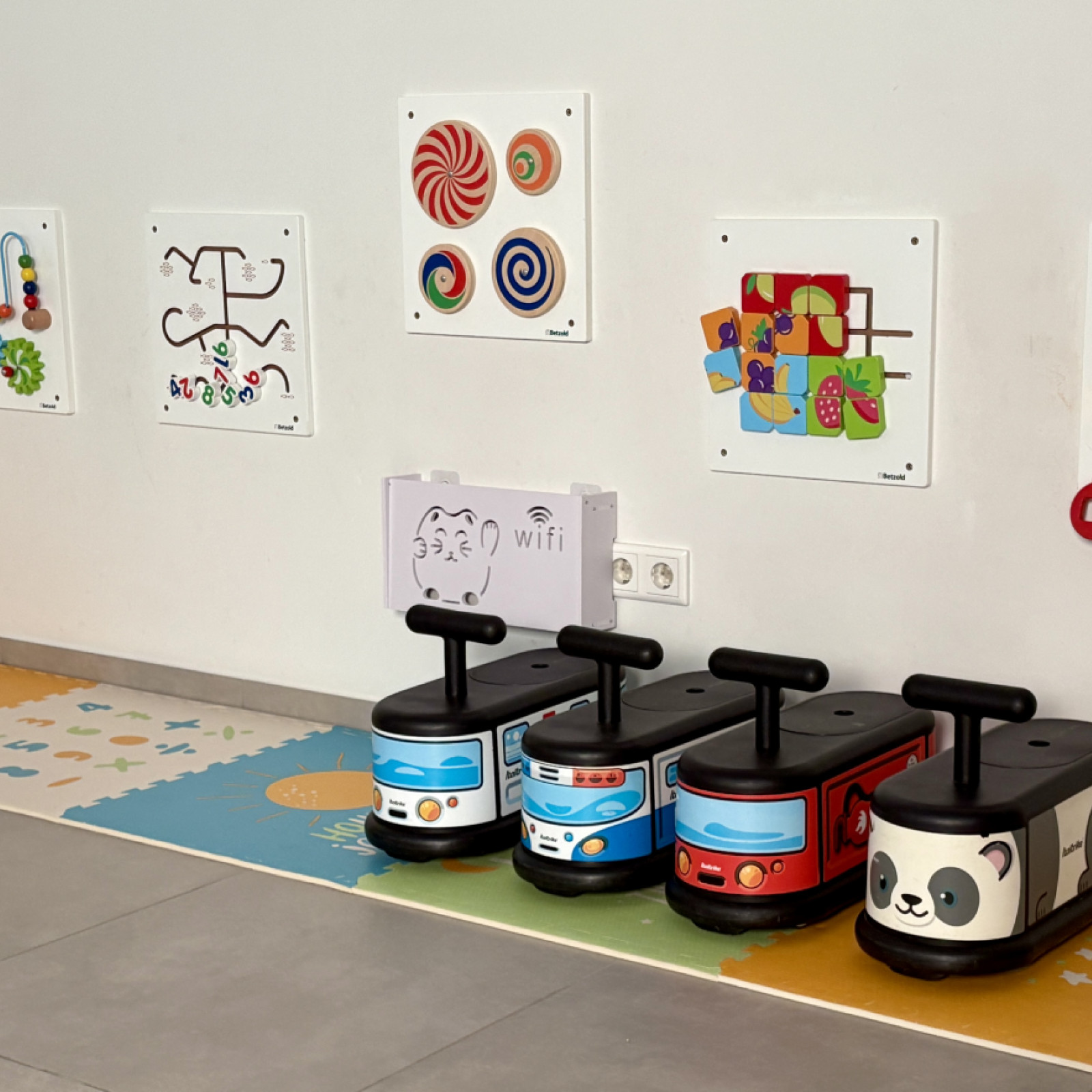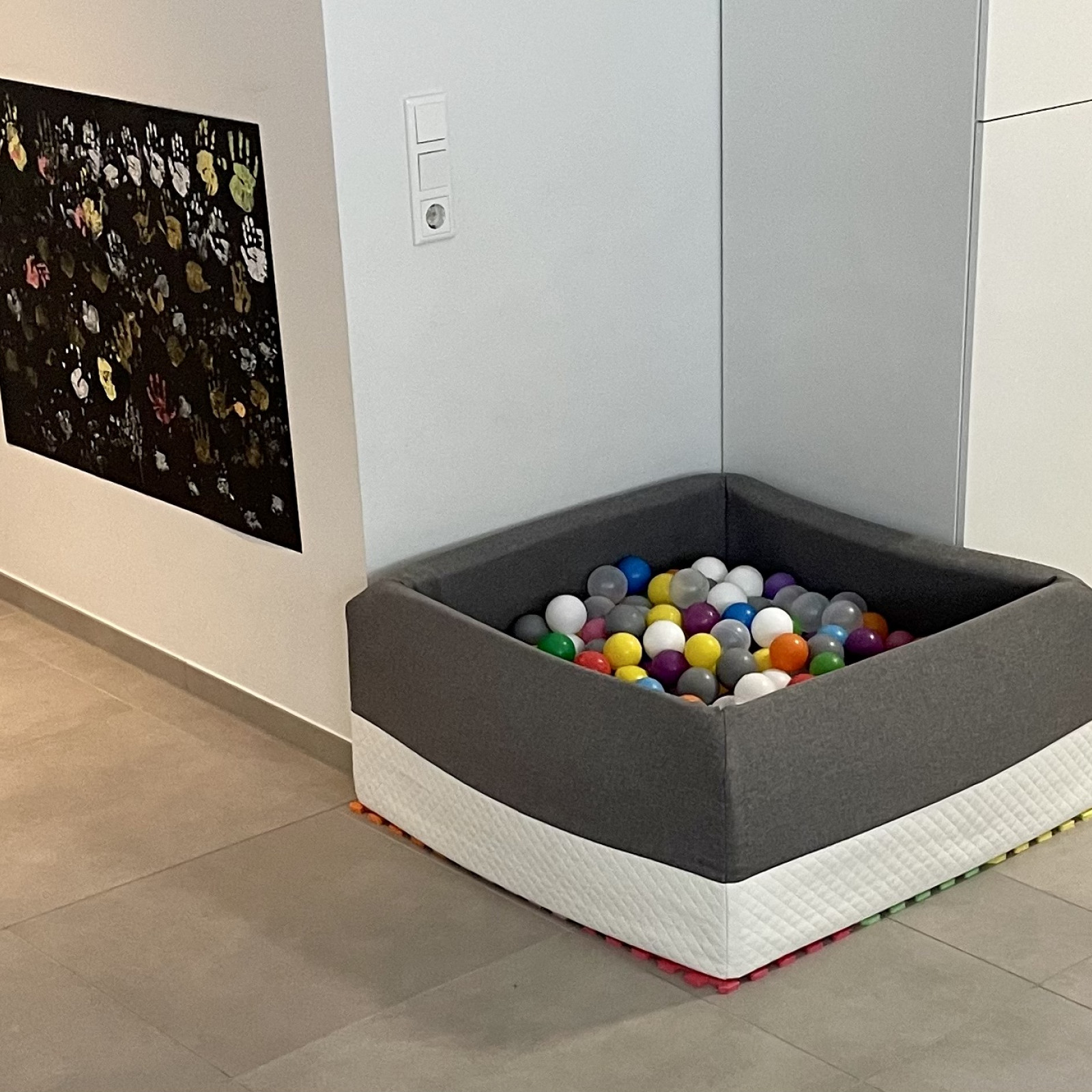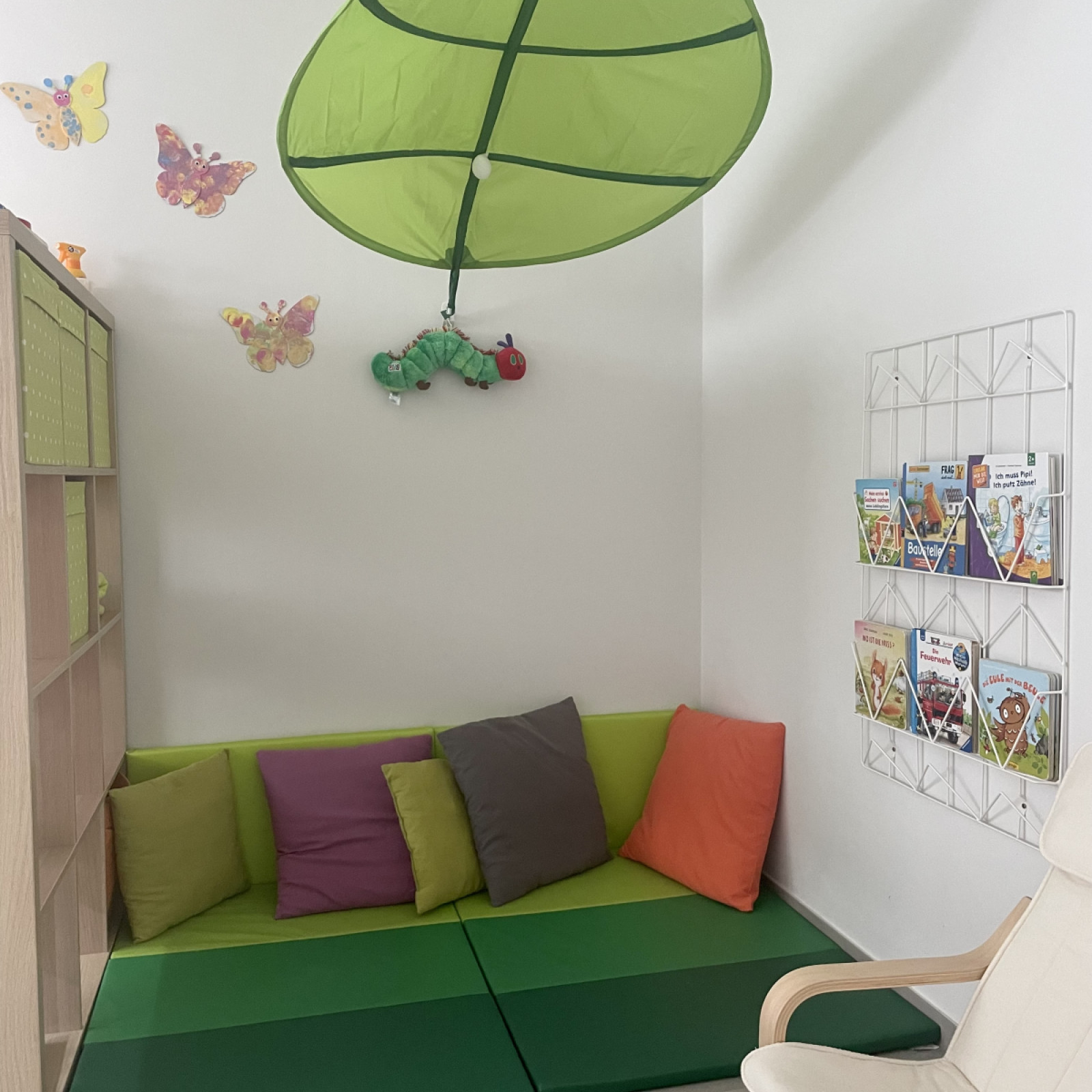 Kinder haben besondere Bedürfnisse an die Einrichtung: Das Badezimmer enthält einen Montessori-Lernturm sowie Töpfchen, sodass die Kinder selbstständig und sicher an alltäglichen Pflege- und Toilettensituationen teilnehmen können. Für den Mittagsschlaf oder um sich auszuruhen gibt es den Schlafbereich mit einem eigenen Bett für jedes Kind. Die Küche ist besonders wichtig: hier bereiten wir – auch oft gemeinsam mit den Kindern – die Mahlzeiten zu und lassen es uns zusammen schmecken. In den Räumen gibt es verschiedene Bereiche zum Basteln, Lesen oder Spielen.